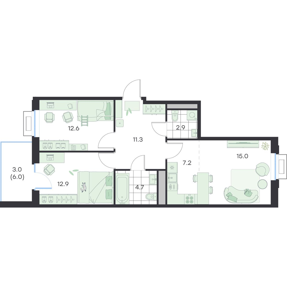 3-комнатная 68 м2