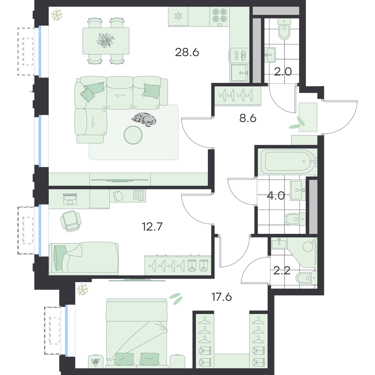 3-комнатная  75.7 м2