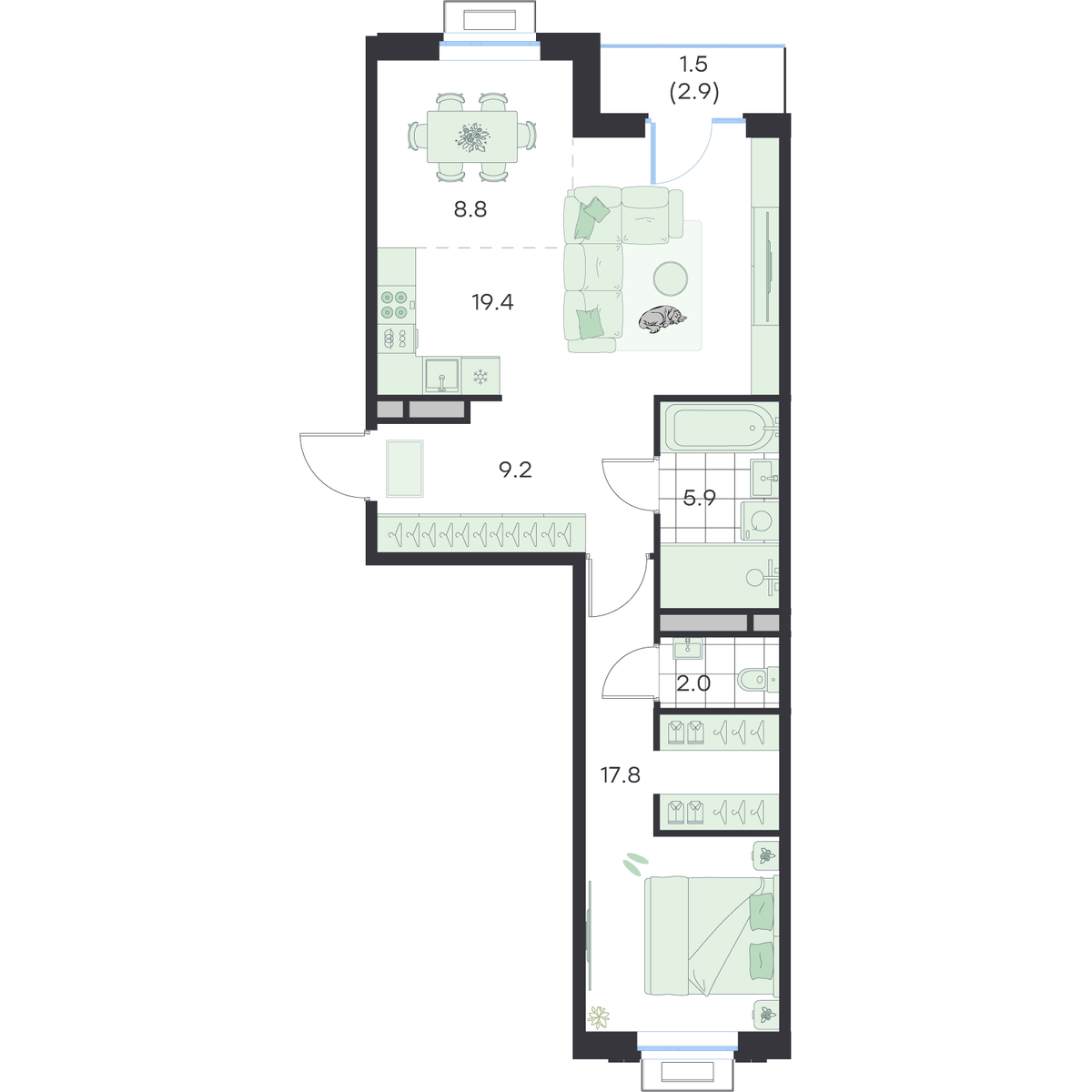 3-комнатная  64.6 м2