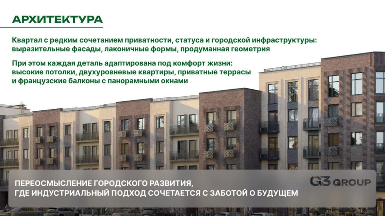 Архитектура выполнена в современной сдержанной стилистике с использованием натуральных материалов и вниманием к деталям – от фасадных решений до входных групп и общественных пространств. Продуманная организация территории включает закрытые дворы без машин, прогулочные маршруты, зоны для отдыха и спорта, а также общественные пространства с большим центральным лобби и местами для работы и встреч.